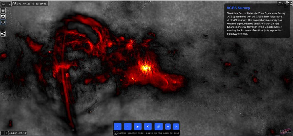 El recurso interactivo dispuesto en el enlace (https://starformation.astro.ufl.edu/Aladin_tours/ACES_EarlyResults.html?description=false&autoplay=true#aces-survey) presenta diferentes visualizaciones del proyecto ACES empleando el atlas interactivo del servicio ALADIN Lite del Centro de Datos de Estrasburgo. Constituye una especie de tour virtual a través de las diferentes estructuras de gas, objetos e investigaciones que se han realizado sobre la Zona Central Molecular de nuestra galaxia en el marco del proyecto ACES.