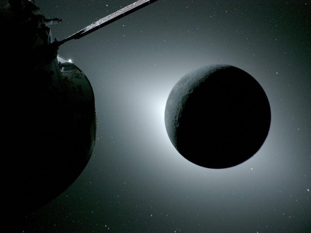 “Capturada por la tripulación de Artemis II durante su sobrevuelo lunar el 6 de abril de 2026, esta imagen muestra la Luna eclipsando completamente al Sol. Desde la perspectiva de la tripulación, la Luna parece lo suficientemente grande como para bloquear completamente el Sol, creando casi 54 minutos de totalidad y extendiendo este evento mucho más de lo que es posible desde la Tierra. Se observa un halo brillante alrededor del disco lunar oscuro. La comunidad científica está investigando si este efecto se debe a la corona, la luz zodiacal o una combinación de ambas. También se aprecian estrellas, normalmente demasiado tenues para ser vistas al fotografiar la Luna, pero con la Luna en la oscuridad, las estrellas se pueden fotografiar fácilmente. El tenue brillo de la cara visible de la Luna es visible en esta imagen, iluminada por la luz reflejada por la Tierra.” (Créditos: NASA)“La Luna, vista aquí retroiluminada por el Sol durante un eclipse solar el 6 de abril de 2026, fue fotografiada por una de las cámaras de los paneles solares de la nave espacial Orion. Orion es visible en primer plano a la izquierda. La Tierra refleja la luz solar en el borde izquierdo de la Luna, que brilla ligeramente más que el resto del disco. El punto brillante visible justo debajo del borde inferior derecho de la Luna es Saturno. Más allá, el punto brillante en el borde derecho de la imagen es Marte.” (Créditos: NASA)“En esta imagen del eclipse solar total, el brillante destello plateado en el borde izquierdo de la imagen es el planeta Venus. La característica redonda de color gris oscuro visible a lo largo del horizonte lunar entre las 9 y las 10 en punto es Mare Crisium, una formación visible desde la Tierra. Vemos tenues detalles lunares porque la luz reflejada por la Tierra proporciona una fuente de iluminación.” (Créditos: NASA)