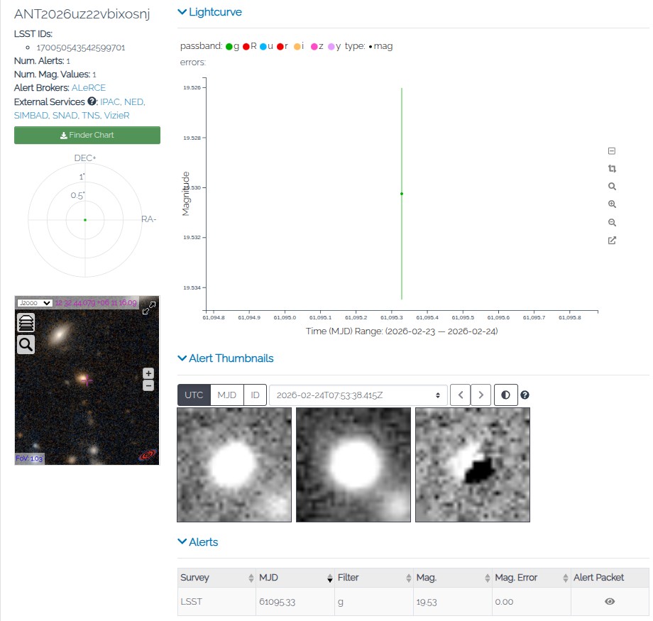 La imagen que se se presenta a continuación es una captura de pantalla que proviene de la plataforma o broker de alertas ANTARES, que fue desarrollada en el Centro de Datos para la Comunidad Científica (CSDC), un programa del NOIRLab (National Optical-Infrared Astronomy Research Laboratory) en NSF.