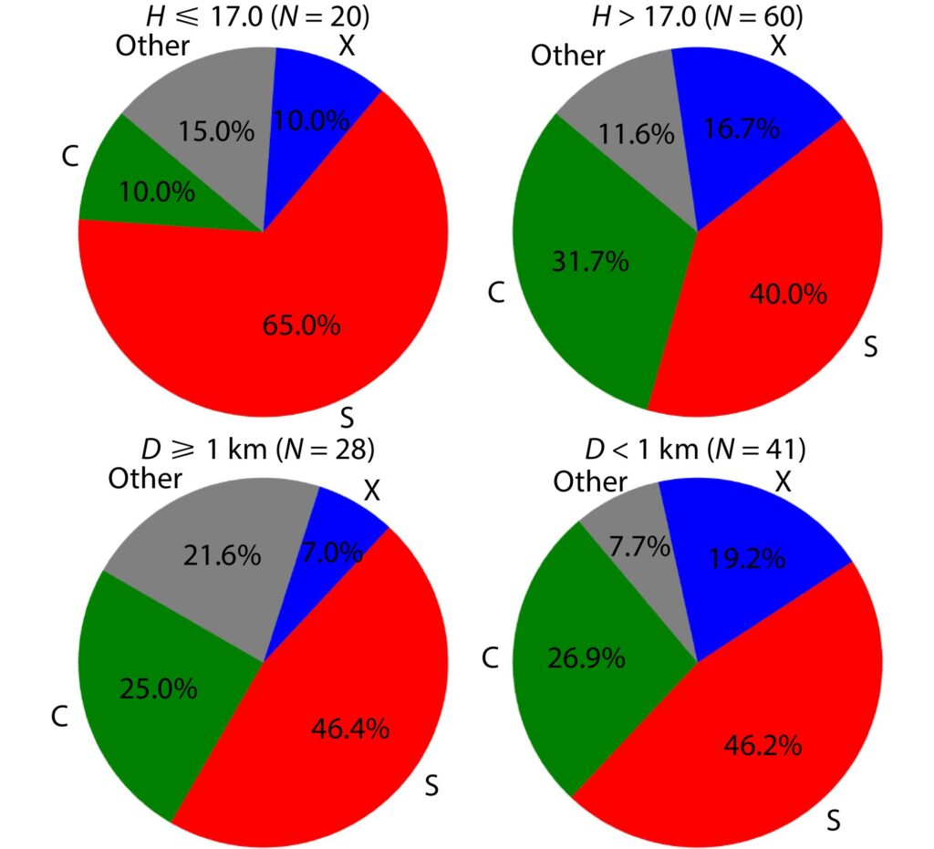 El estudio también identificó tres asteroides del tipo P, una categoría más rara y con composiciones particulares bajo el esquema de clasificación de Tholen.