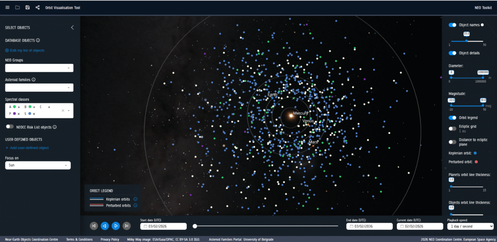 Estimado lector, si usted es docente de ciencias en enseñanza secundaria o la universidad, investigador o un ciudadano interesado en las ciencias del espacio, puede practicar sobre conceptos relacionados con los Asteroides Cercanos a la Tierra (NEAs) mediante la herramienta online NEO Toolkit que ha desarrollado la Agencia Espacial Europea; la cual puede encontrar en el siguiente enlace: